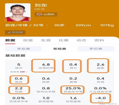 值得一提的是,本场比赛,山西队11人有得分或数据进账,唯独有一人,主要数据为0,对球队的贡献为-8,而这个人正是刘东。全场比赛,刘东出战4分07秒,数据为0分0板0助0断,所有数据中只有1个失误。更要命的是,全队赢了14分,而刘东在上场的4分多钟里,球队却输了8分(正负值-8)。这还没完,刘东打了短短4分钟,竟然5次犯规离场,平均50秒左右一个犯规……